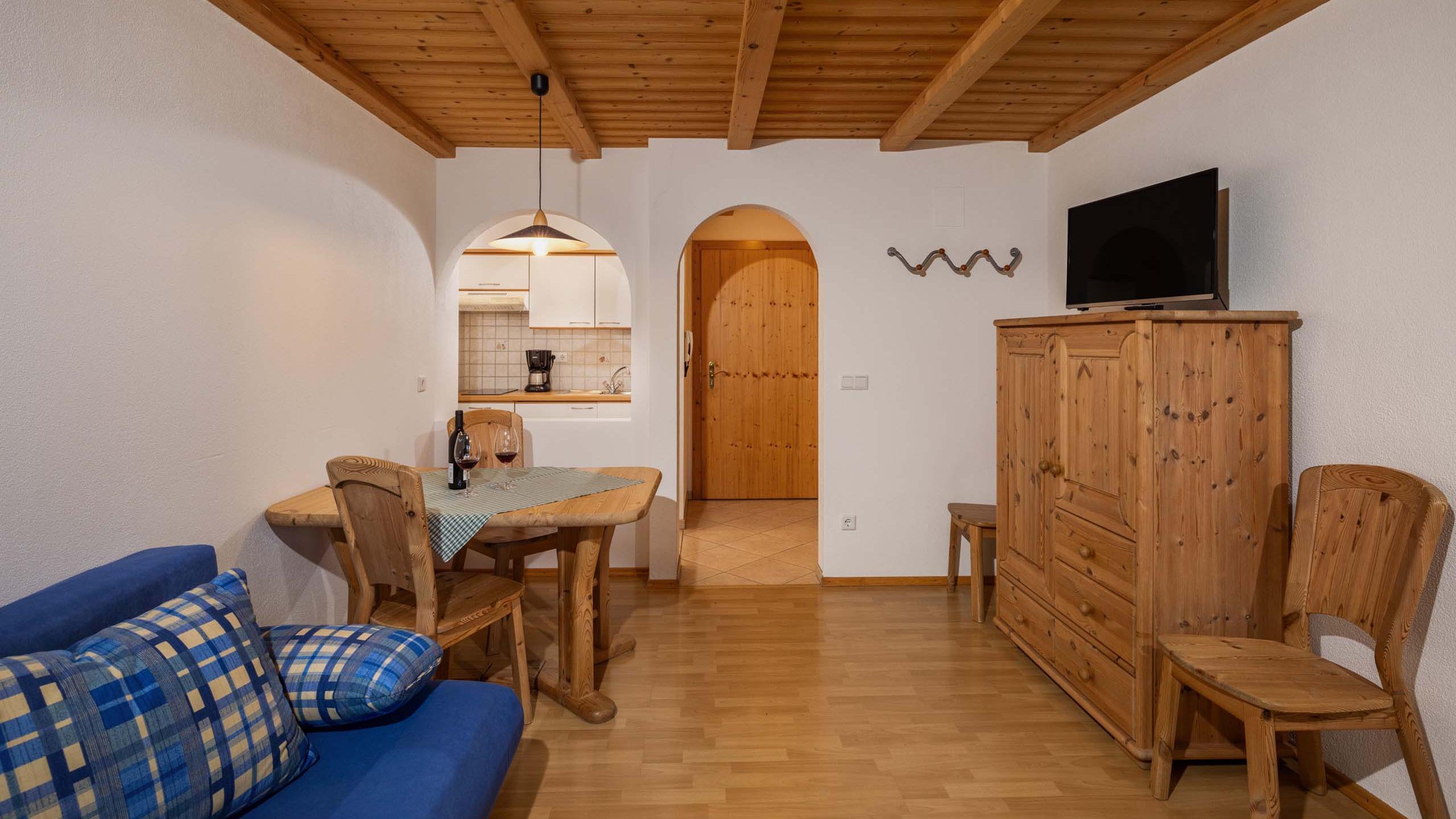 Dalla stube di questo confortevole appartamento godrete di una vista fantastica sulle vette dei nostri dintorni. L’appartamento dispone di una camera con letto matrimoniale, una piccola cucina attrezzata e un bagno con doccia e WC.
